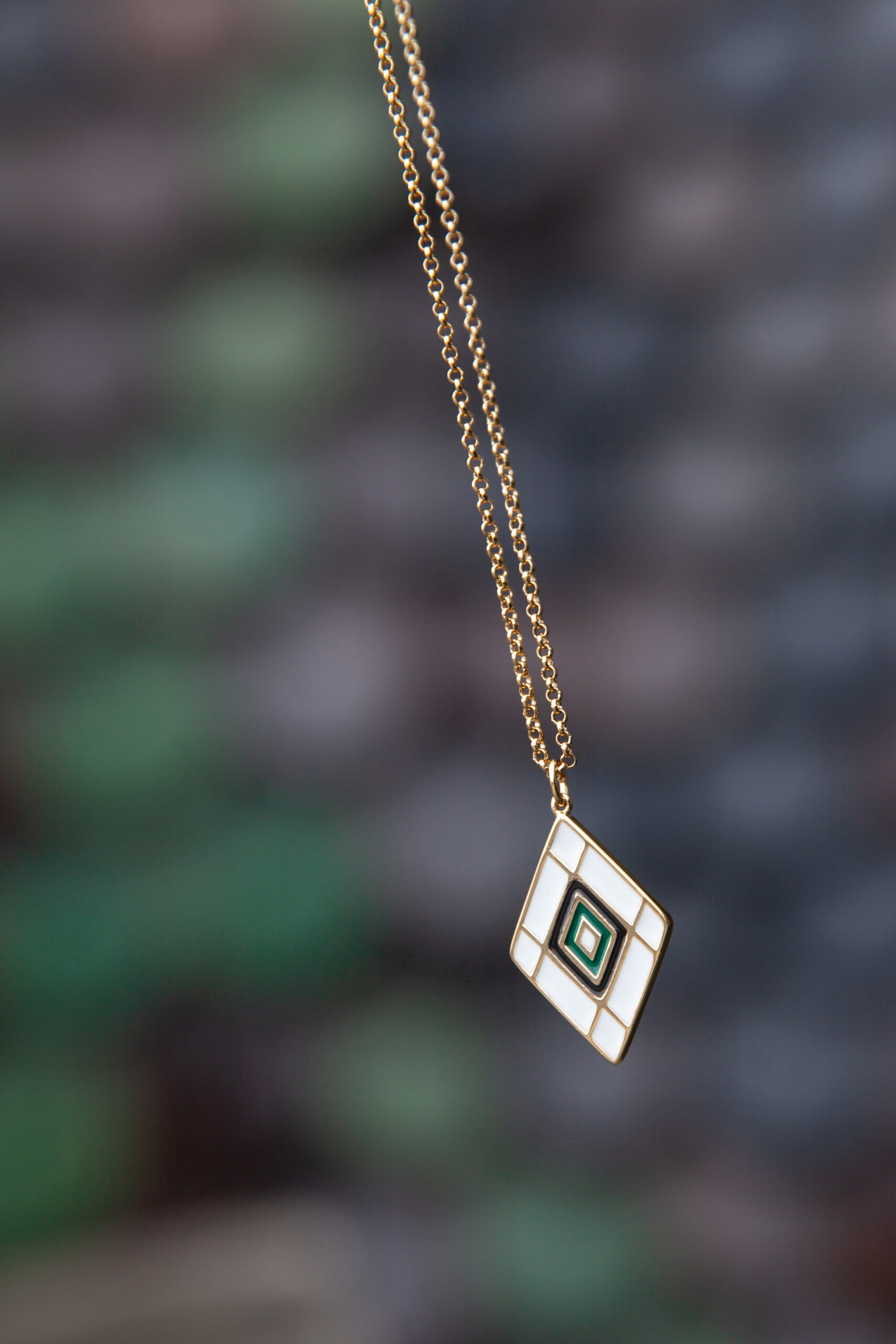 Unsere vergoldeten Schmuckstücke aus Messing, sind in Weiß, Schwarz und Grün emailliert und zeigen ein stilvolles Dachrautenmuster.